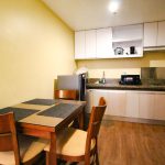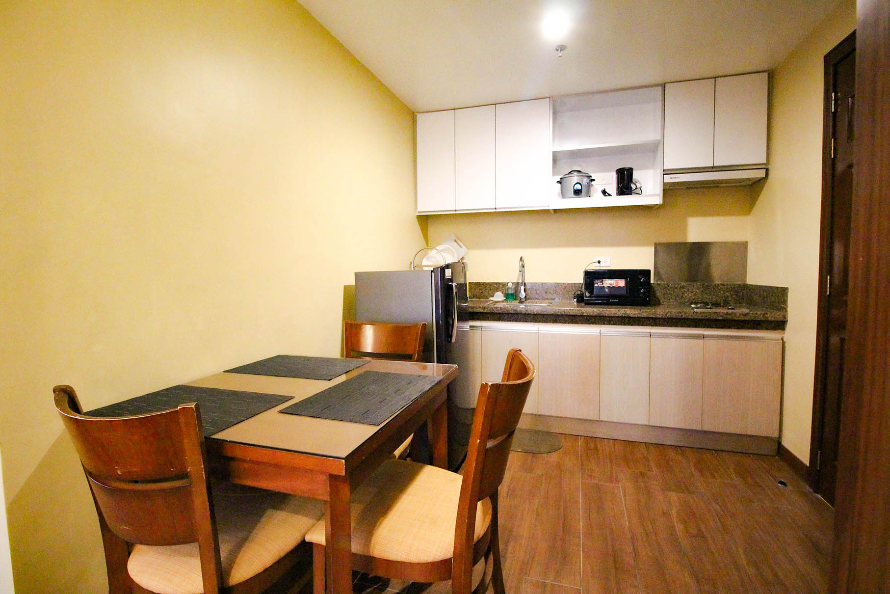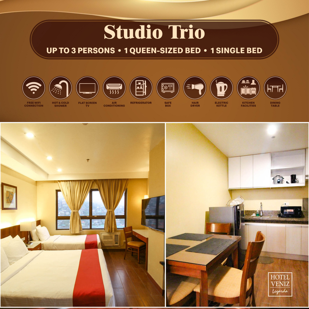 The studio trio has a refrigerator, TV, kitchen, kitchen with cooking facilities, one queen sized bed, one single bed and a private bath.